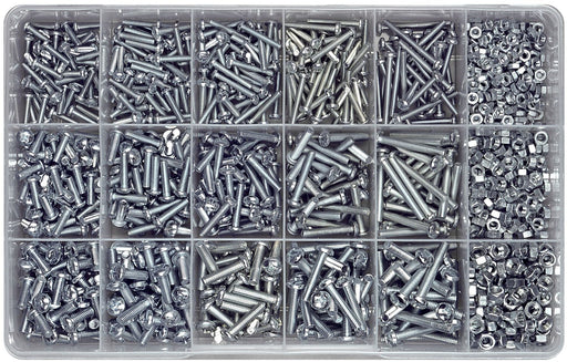 Assortment of metal thread pan phillips head screws in M4, M5 and M6 in 16mm, 20mm, 25mm, 30mm and 40mm with hex nuts to suit each size