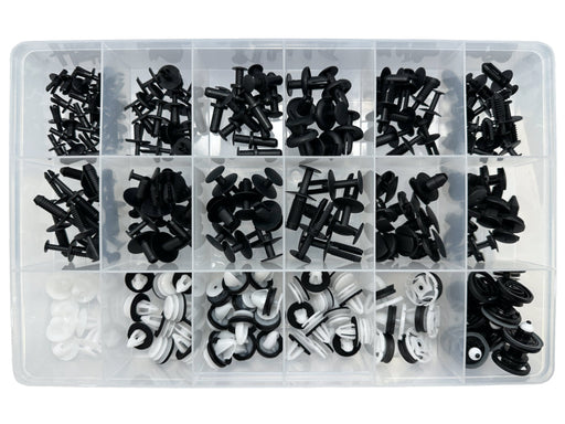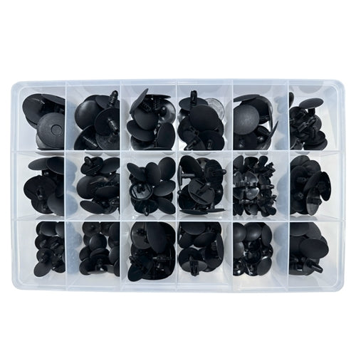 Asssortment of the most popular push type retaining scrivets with varying head sizes, stem lengths and diamaters. To suit Toyota, Subaru, Honda, Ma...