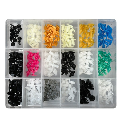 Assortment of plastic pop rivets with 3.2mm to 6.7mm diameters. Suits Holden, Ford, Toyota, Volkswagen and many European makes