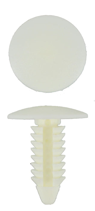 Christmas Tree WHITE - Fender and Bumper Shield Retainer. Stem Length: 20mm, Head Diameter: 17.8mm, Stem Diameter: 7.6mm, Fits 6.5mm-7mm Hole.